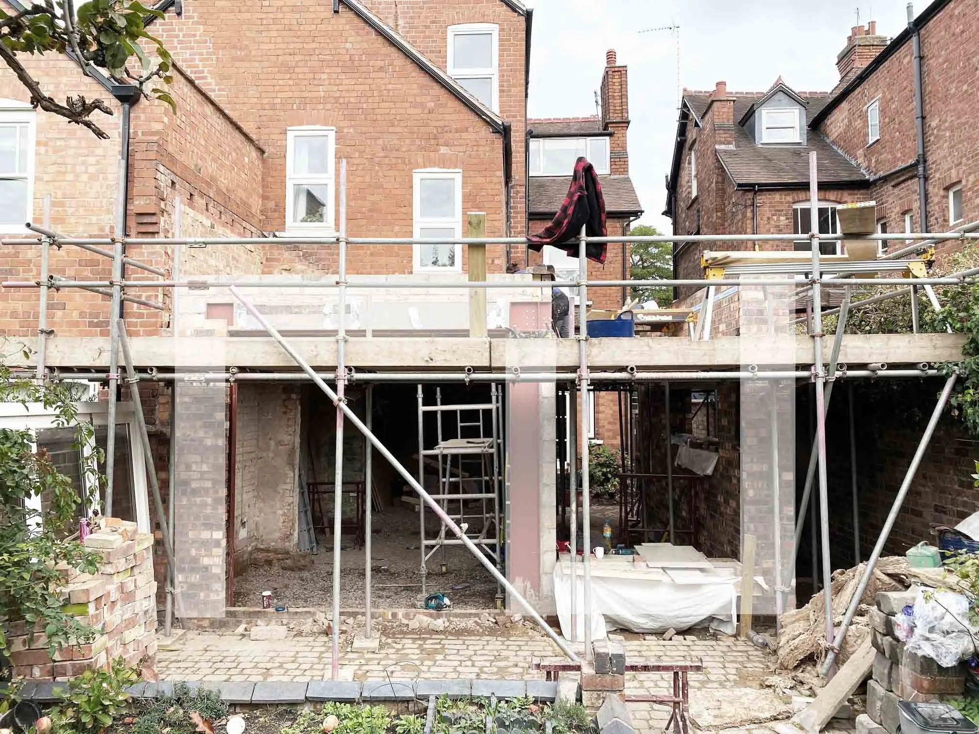 The 440mm thick ‘garden wall’ is standing confidently, awaiting installation of the structural glazing. This wall frames a key vista between the original dining space within the host dwelling and private rear garden space.